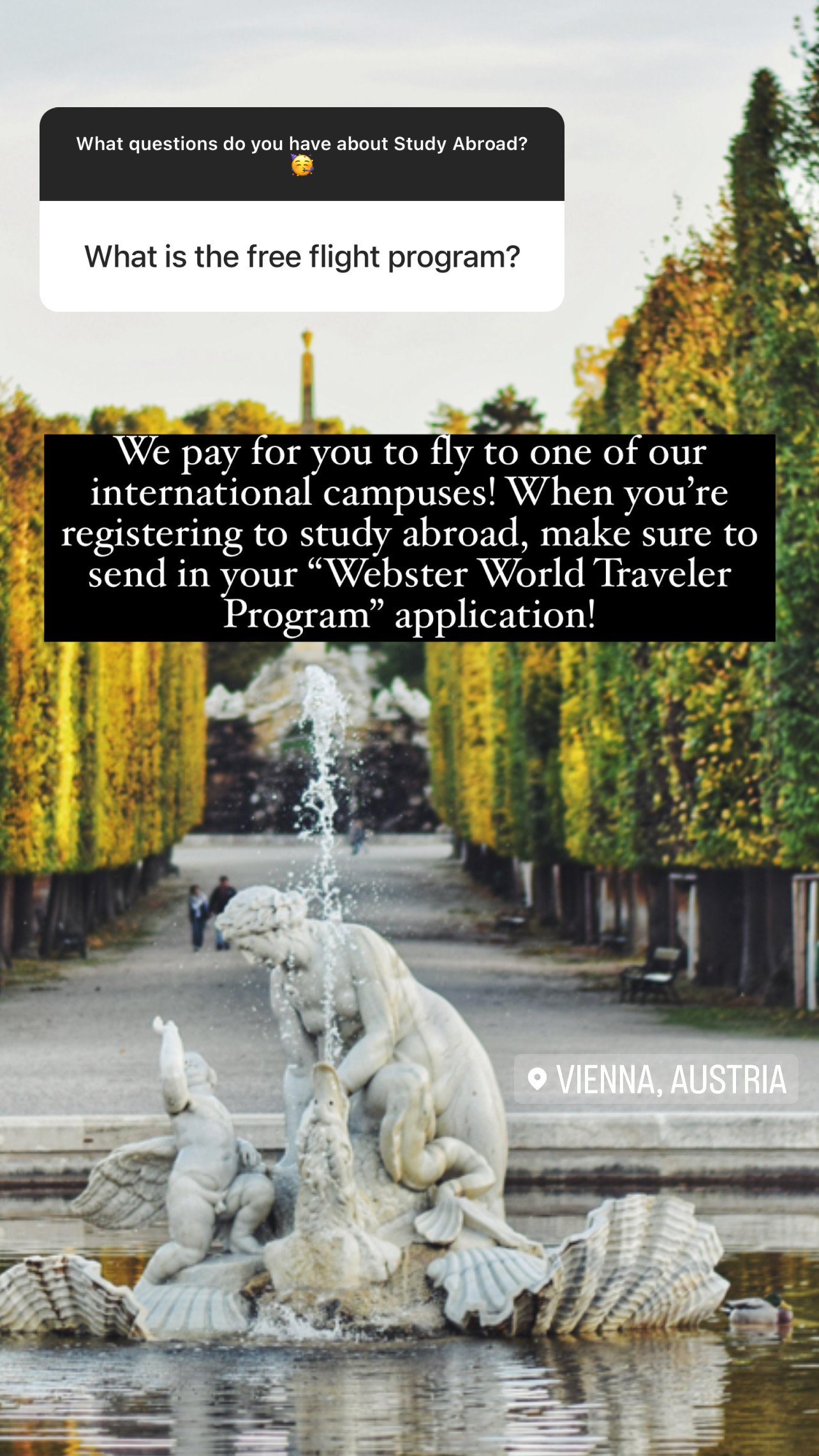 At this time, we will also be using Instagram stories in order to create interactive content with Webster students, offering Q&A’s through Instagram to make it easier for students to get access to information without having to physically come to the Study Abroad office or send an e-mail.